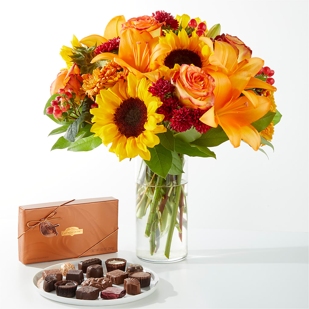 Capturing the beauty of the season, the Fall Day Bouquet brings all the warmest tones with sunflowers, roses and lilies.
